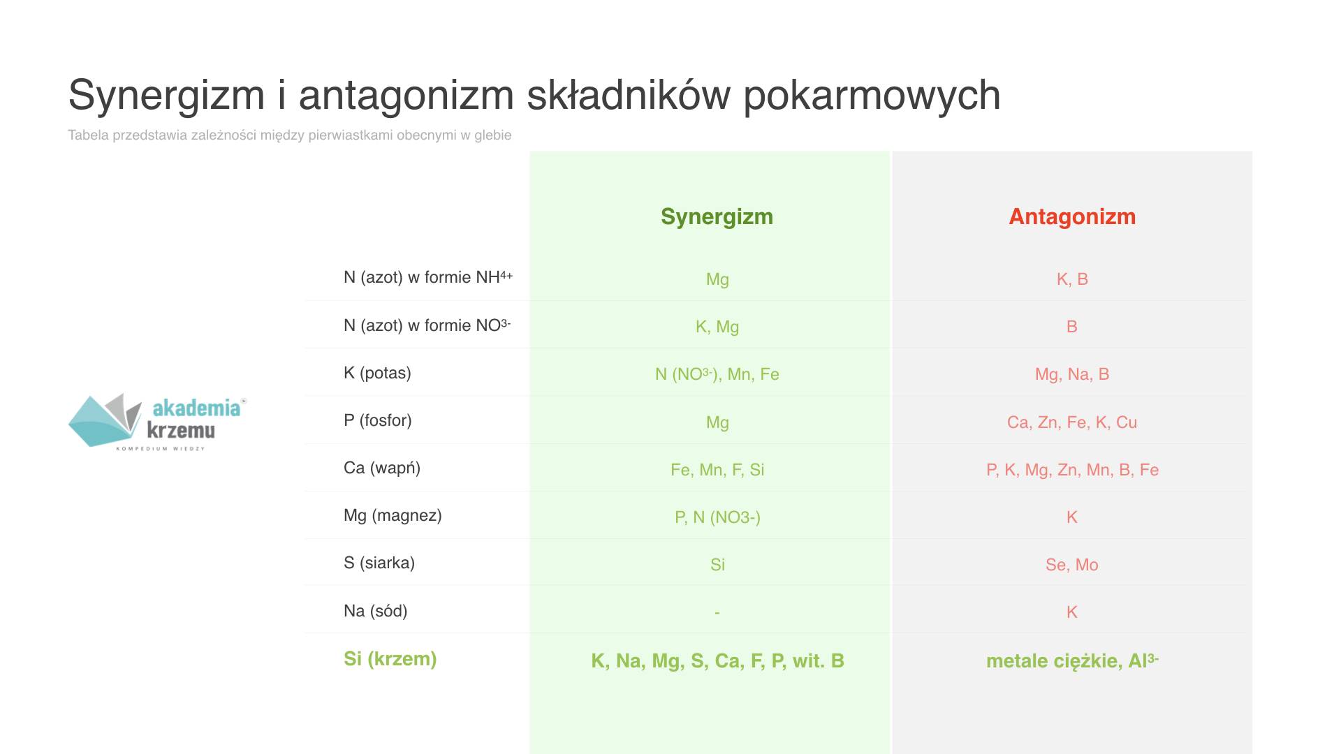 Warto podkreślić, że krzem jest jedynym składnikiem pokarmowym nie wykazującym antagonizmu względem innych składników pokarmowych dla roślin. Co więcej, to wyjątkowo “przyjazny” pierwiastek, który dobrze współpracuje z innymi składnikami pokarmowymi zwiększając ich pobieranie, a blokuje oddziaływanie metali ciężkich.